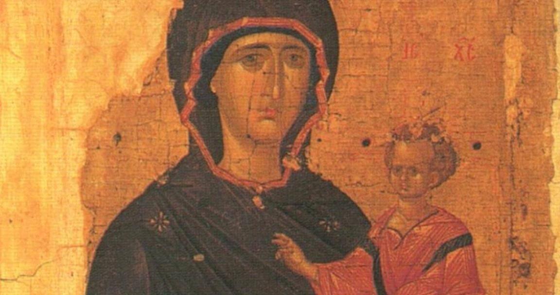 Дева Мария отображается на иконах с волосами, спрятанными под мафорией (особой накидкой), ниспадающей на её плечи. Эта накидка, в действительности, носилась во времена Христа в Израиле. Головной убор, как правило, красного цвета, подчёркивает благородное происхождение Богородицы и — одновременно! — это цвет крови, квинтэссенция Её страданий.