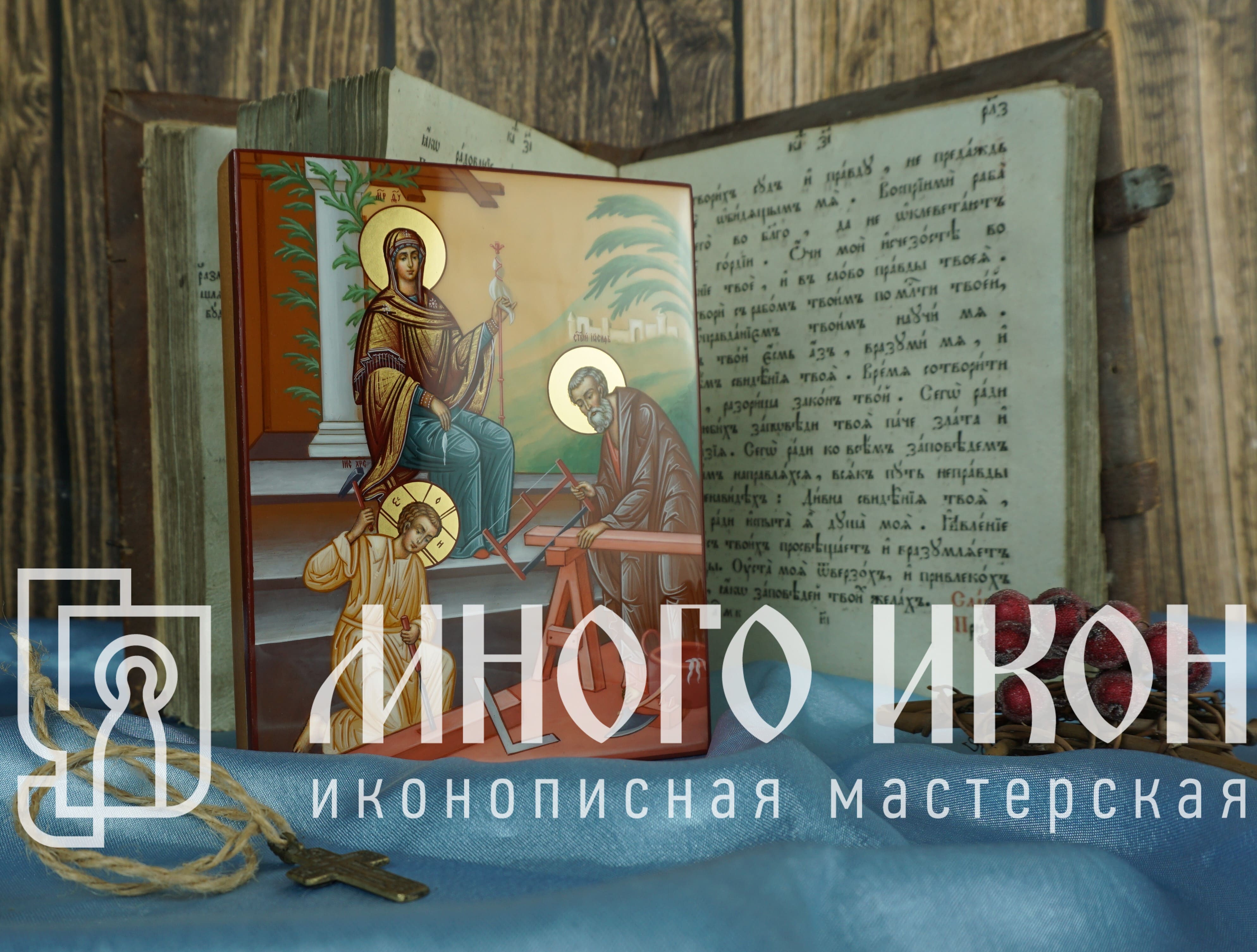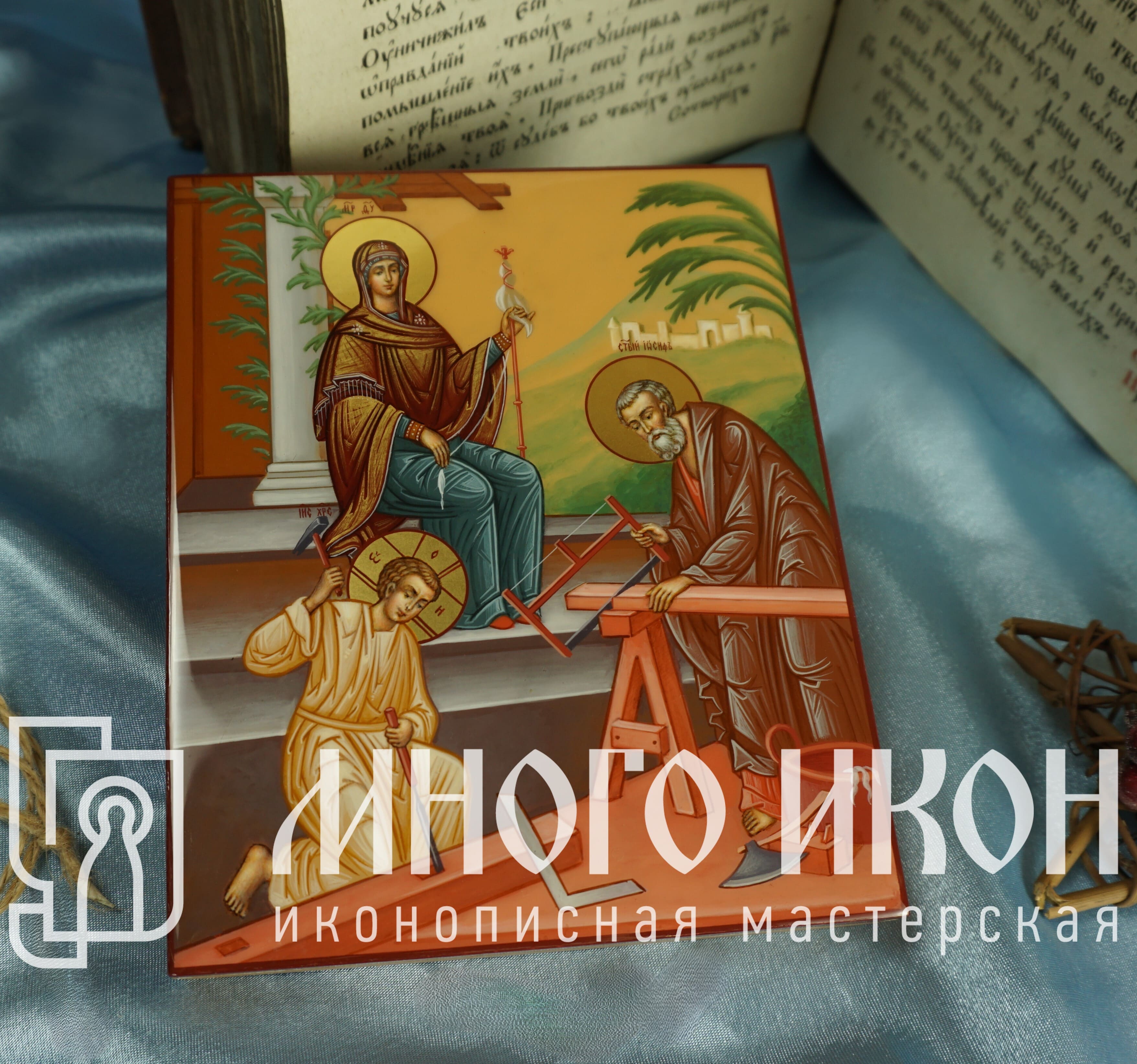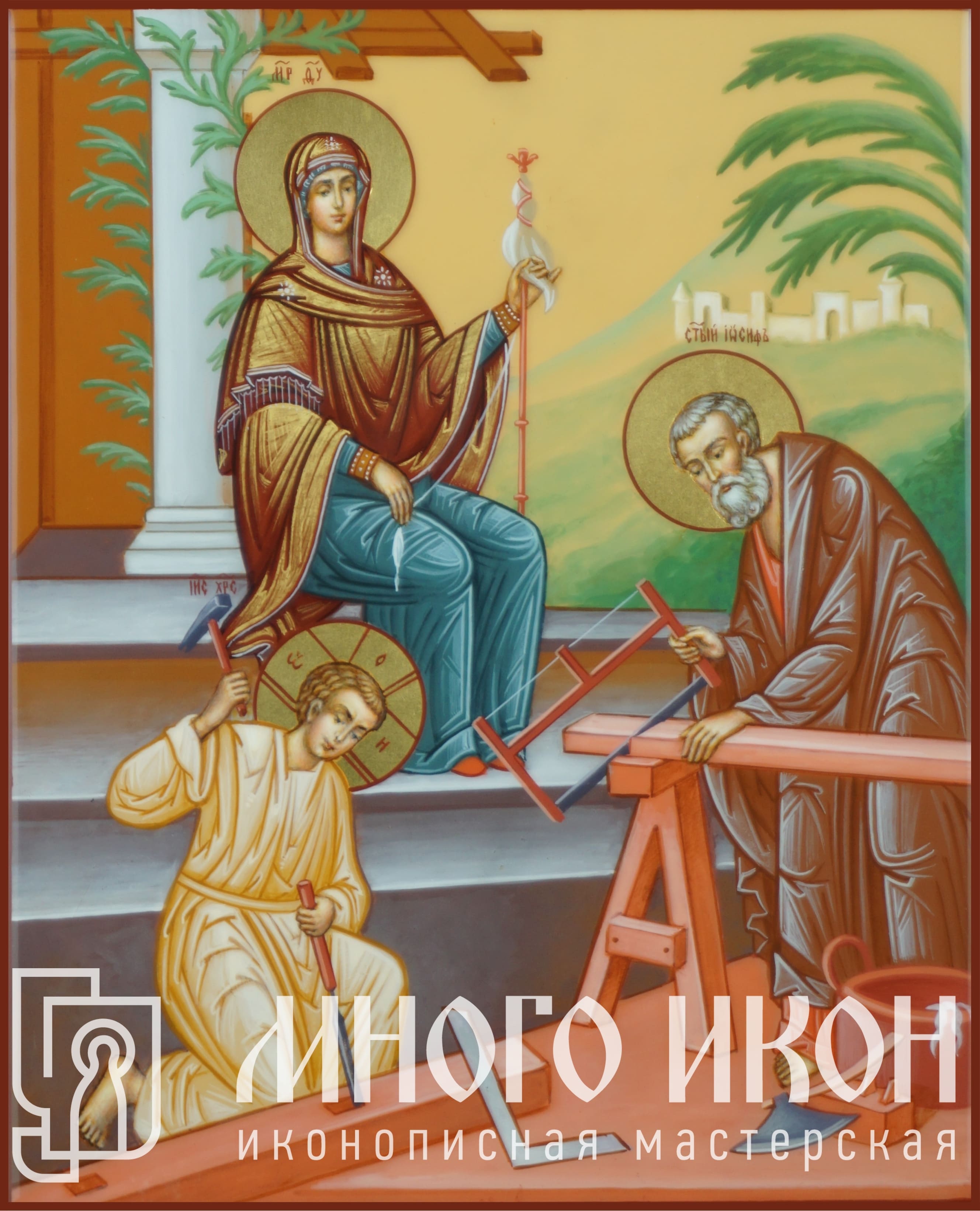 В основе образа нехарактерный для русской иконописи сюжет, иллюстрирующий Событие из детских лет Спасителя: Богородица и Святой Иосиф трудятся в плотницкой мастерской.