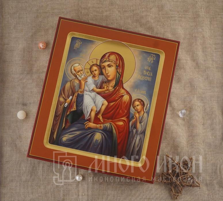 Свое название икона получила после одного удивительного случая. На некую женщину обрушилось сразу три несчастья: её муж был безвинно осужден и отправлен в ссылку, всё имущество отошло казне, а сына, который участвовал в военных действиях, взяли в плен. Несчастная женщина непрестанно молилась о помощи своему семейству, и во сне ей было откровение. Пресвятая Богородица повелела найти в Москве икону Святого семейства и помолиться перед ней. Женщина обошла множество храмов и, наконец, отыскала нужную икону в Троицкой Церкви. После горячей искренней молитвы она получила три радостных известия: ее муж был оправдан и вернулся из ссылки, сына вызволили из плена, и все ранее конфискованное имущество было возвращено владельцам.